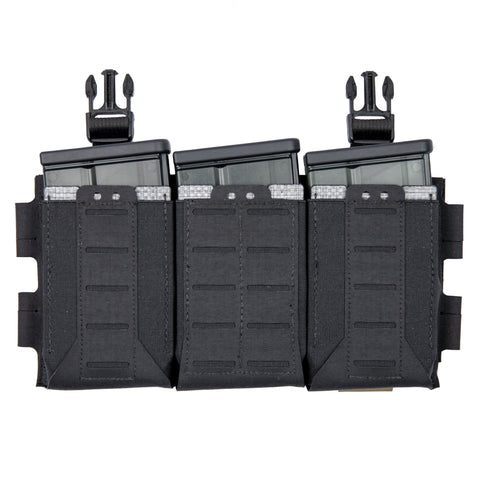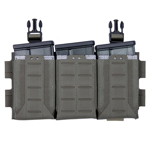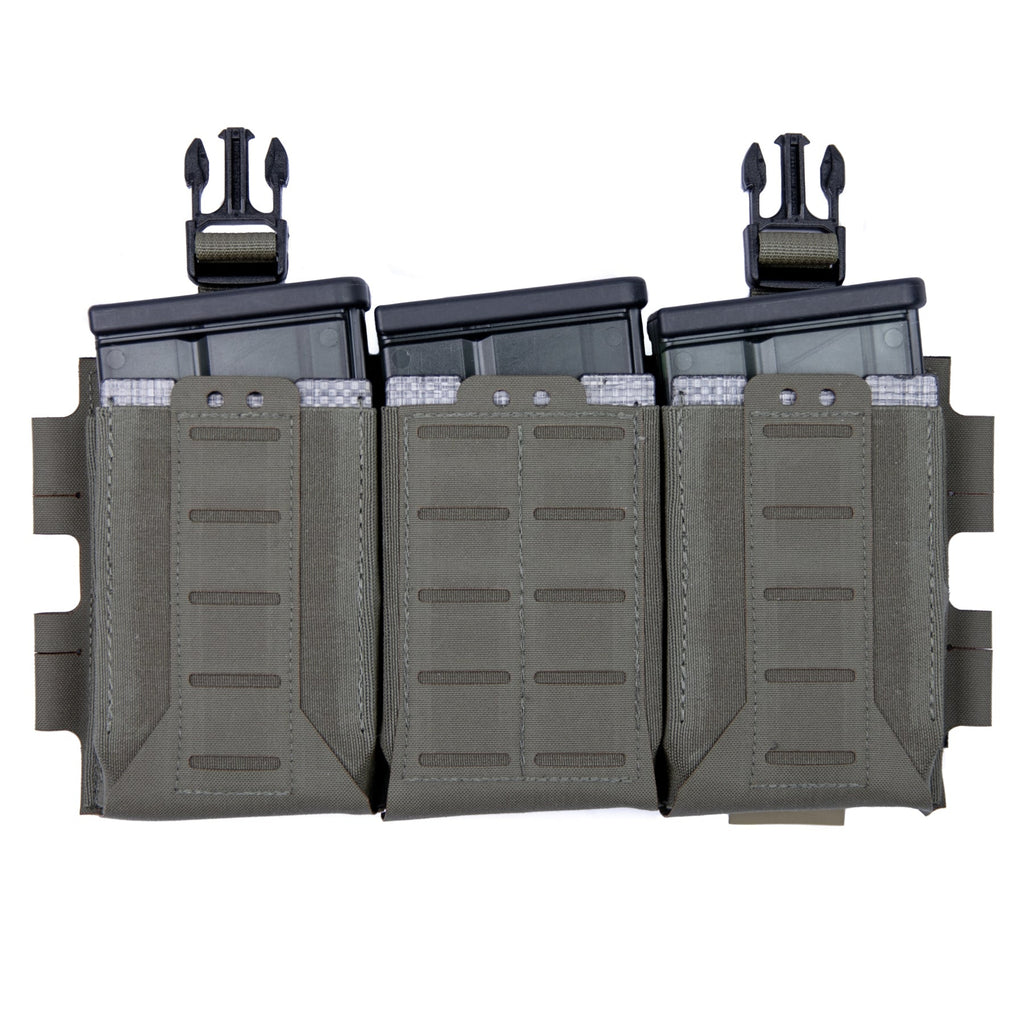 Our low profile purpose-built elastic design minimizes bulk and weight. Laser cut MOLLE columns are sewn to the front of each magazine cell. These allow for mounting of zipper GP pouches, handgun magazine pouches, tourniquets, or other equipment. The front laser-cut MOLLE mounting field is equivalent to 6 columns of conventional MOLLE. Any wide GP or elastic panel designed to mount to 6 columns of MOLLE can be attached.